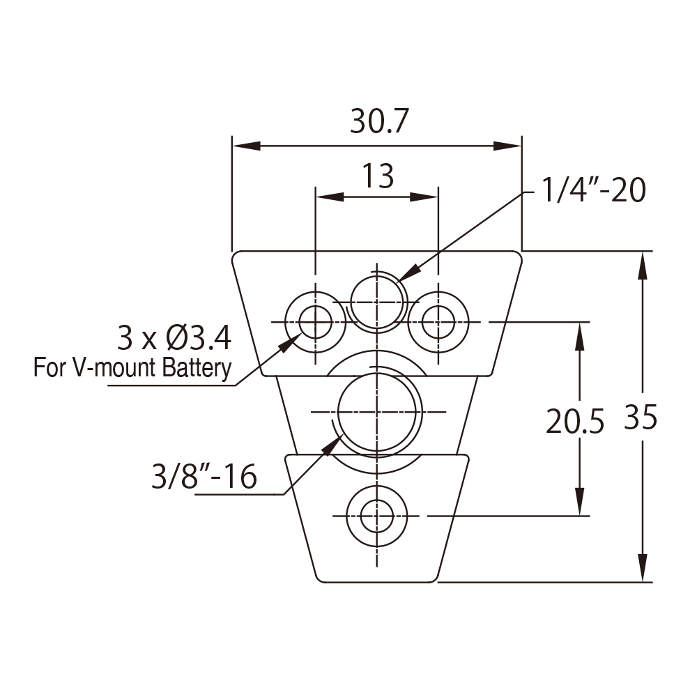 3 отверстия типа M3 и винтами для надежного крепления к любой стандартной V-Lock батарее.