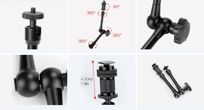 2 резьбовых крепления 1/4"-20 на концах кронштейна присоединены к шарнирам, поворачивающимся на 360 градусов, плюс выемка на хомуте, окружающем шар, даёт возможность наклона резьбового крепления на 90 градусов.