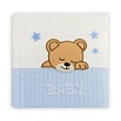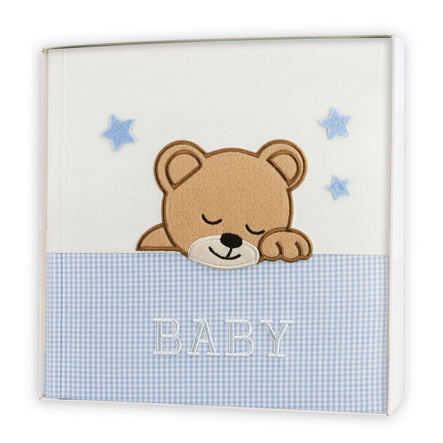 Традиционный детский альбом в книжном переплёте с текстильной обложкой  и аппликацией в виде мишки и звездочек. Размер альбома: 24x24 см, в альбоме 40 белых, не содержащих кислоты страниц, белые пергаминовые  межстраничные листы. Есть одна  иллюстрированная страница для записи. Для крепления фотографий необходимы аксессуары ( стикеры, уголки, клей). В одном альбоме можно совмещать разные форматы фото. Альбом упакован  в коробку.