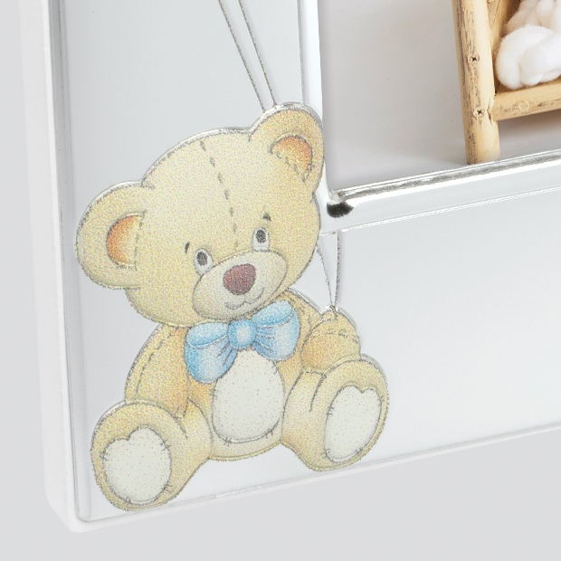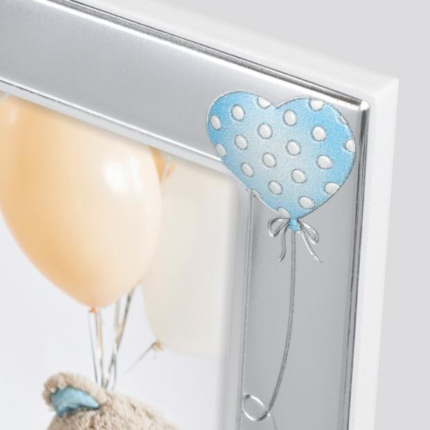 Фоторамка ZEP серия SILVER PLATED  сделана в Италии из посеребренного  алюминия. Для обработки поверхности  используется напыление серебром. Такое покрытие характеризуется высокой прочностью и устойчивостью к окислению. Профиль рамки рельефно украшен мишкой и голубыми шарами.  Задник рамки выполнен из дерева